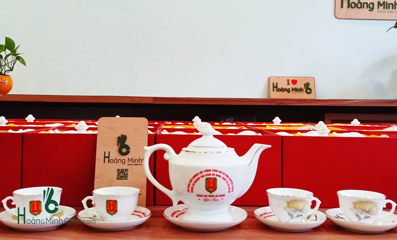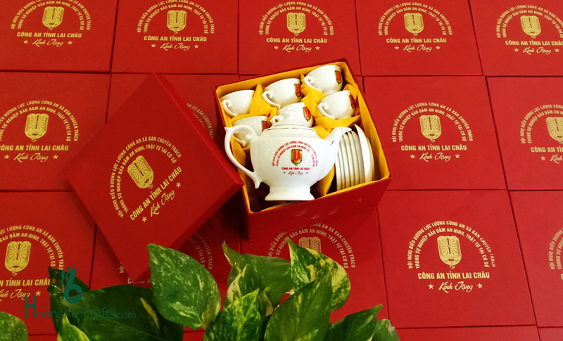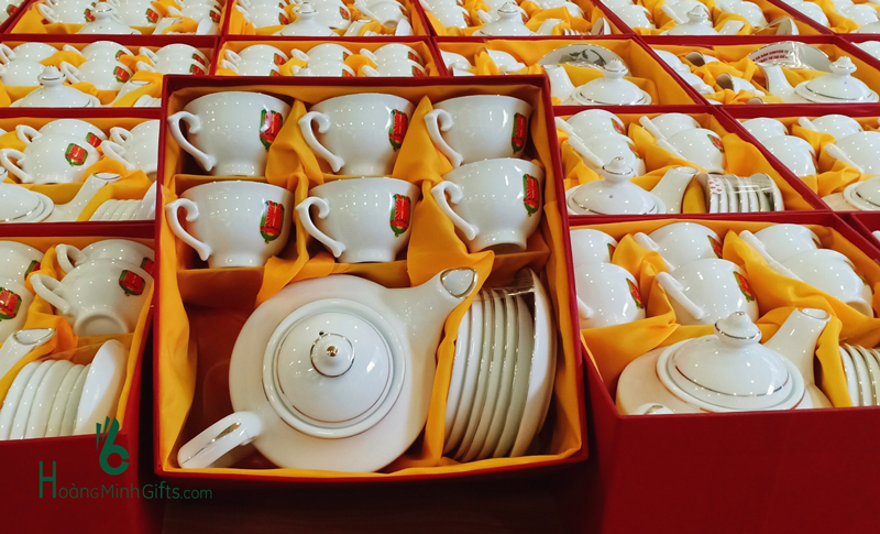 Bộ ấm chén sứ trắng Bát Tràng gồm 1 ấm, 6 chén, 6 đĩa, đựng trong hộp giấy lót lụa, in ấn logo theo yêu cầu